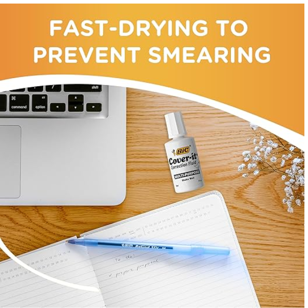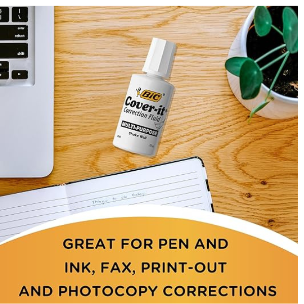 Cover minor errors on school or office documents with BIC Cover-it Correction Fluid. This quick-drying white fluid works on handwritten or printed ink, faxes, and photocopies. The correction fluid offers extra coverage for smooth, one-time application and is easy to apply with the included brush. For best results, shake the correction fluid before using.