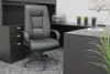 This executive chair with padded fixed arms is made with an upholstery material called LeatherPlus, which is a leather infused with polyurethane and boast a sturdy 27 inch nylon base with 2 inch nylon dual wheel castors. The chair also offers a spring tilt mechanism which allows one to change the angle of the entire seat relative to the floor and allows one to transfer some of the upper body weight to the backrest of the chair. In addition to the spring tilt mechanism the chair also offers tilt tension, a pneumatic gas lift for an easily adjustable height and an upright lock.