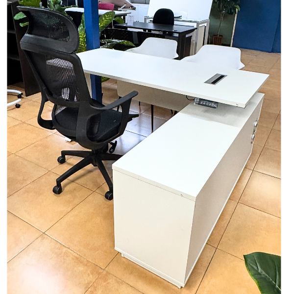 The standing desk comes in a L-shape design, which makes it space-saving and versatile. The 1400 side desk/cabinet is fixed while the front of the desk features the height adjustment feature.